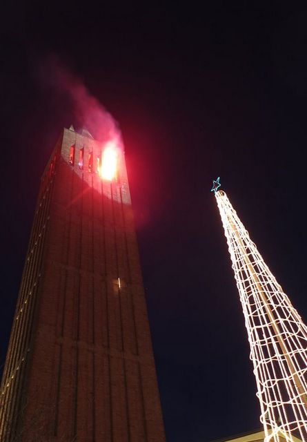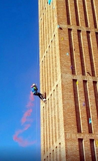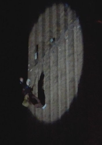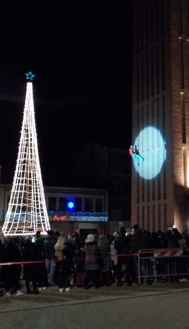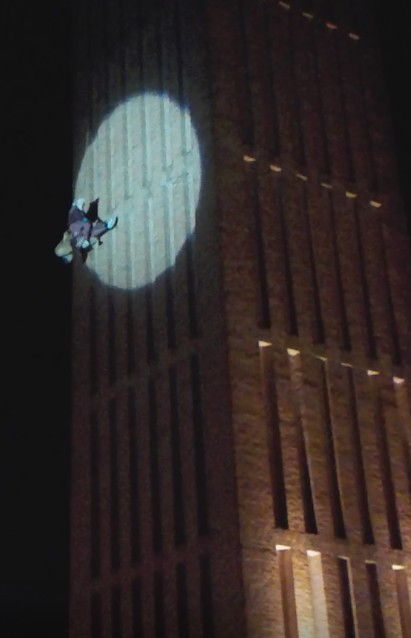 Lorenzo nell'attesa accende un fumogeno luminoso la cui luce rossa si staglia sopra l'albero stilizzato, poi scende in corda doppia Stefano, l'apripista, tutti gli occhi sono puntati su di lui e il cerchio di luce che parte dalla piazza.