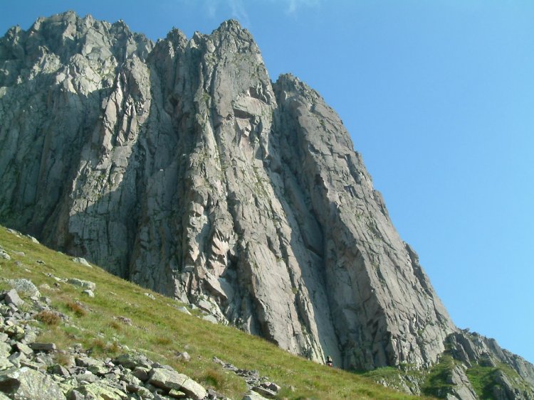 Per pietrame e pendii erbosi raggiungiamo la base delle rocce.