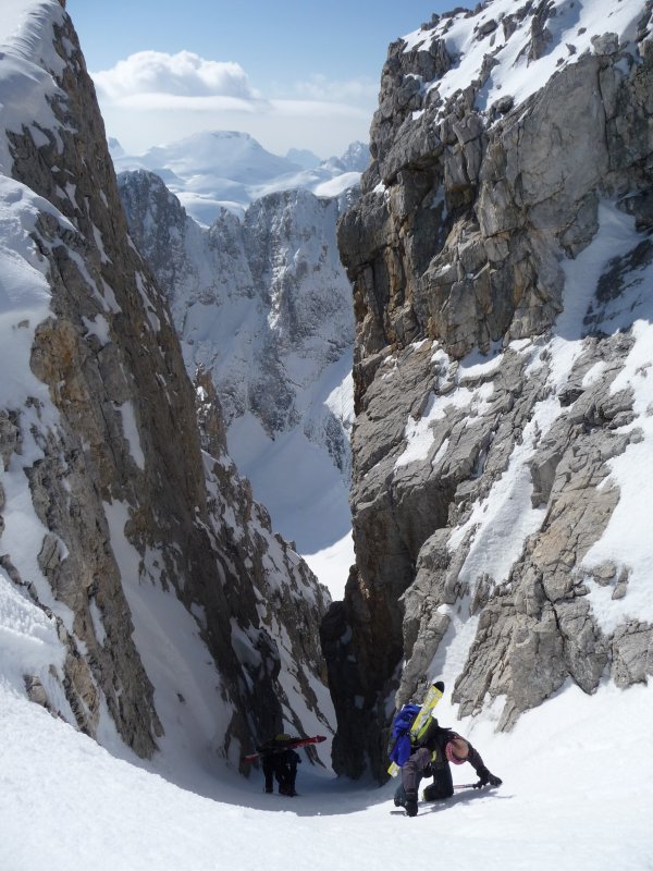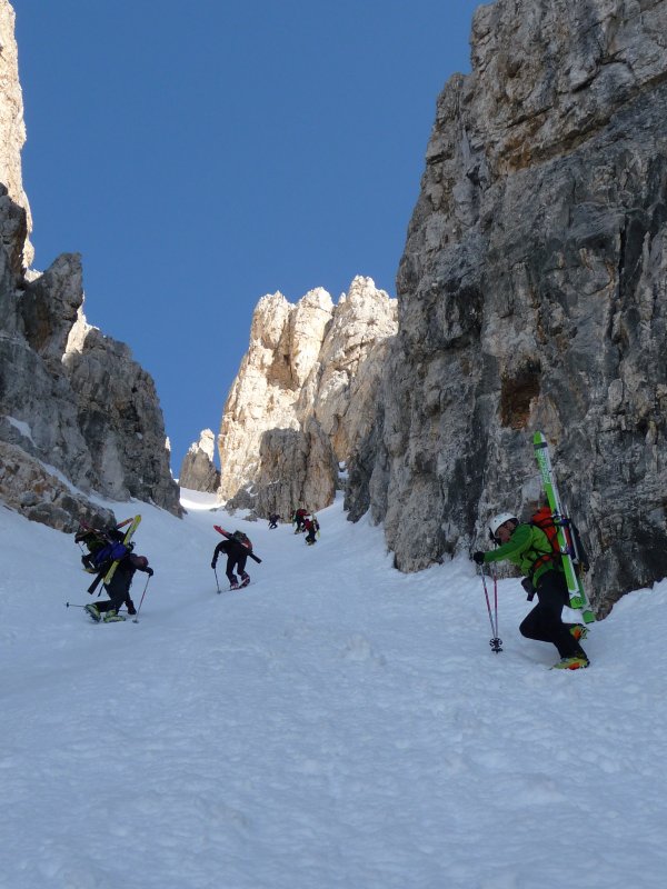 All’imbocco del canale togliamo gli sci e calziamo i ramponi, il pendio