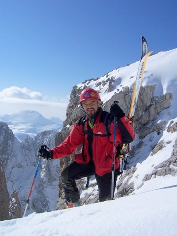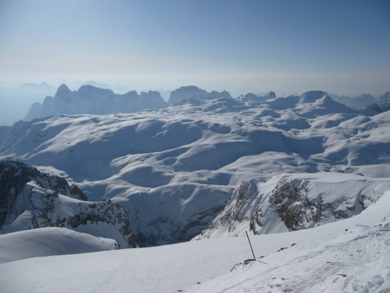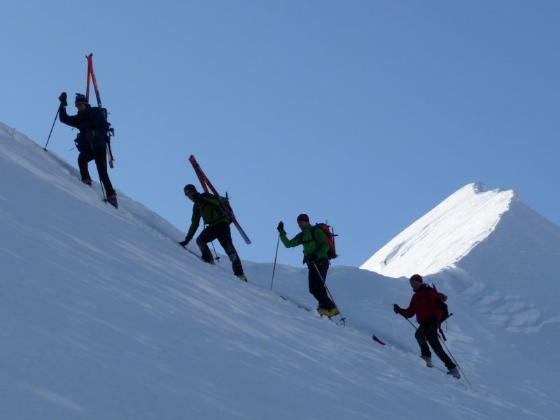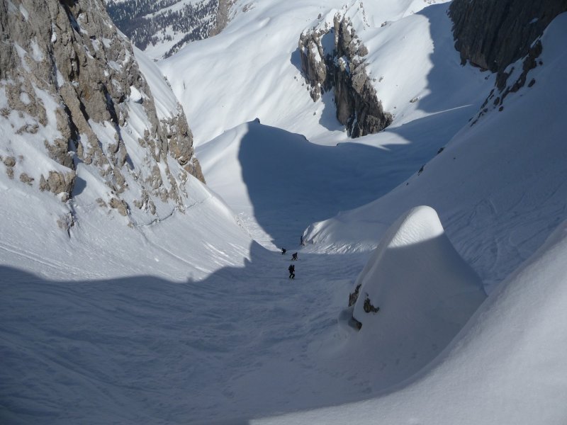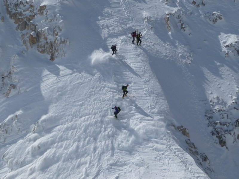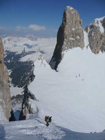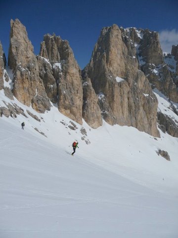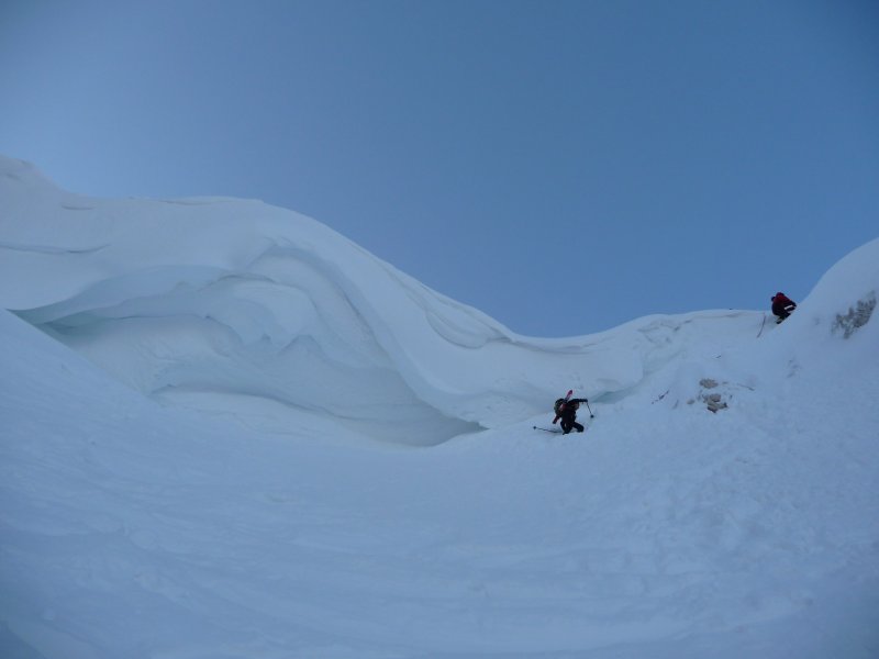 Ad eccezione di un breve tratto dove togliamo gli sci, ci godiamo la discesa con neve ottima, trasformata al sole e polverosa all’ombra; anche il ripido pendio che d’estate presenta un tratto attrezzato è completamente innevato… che curve!