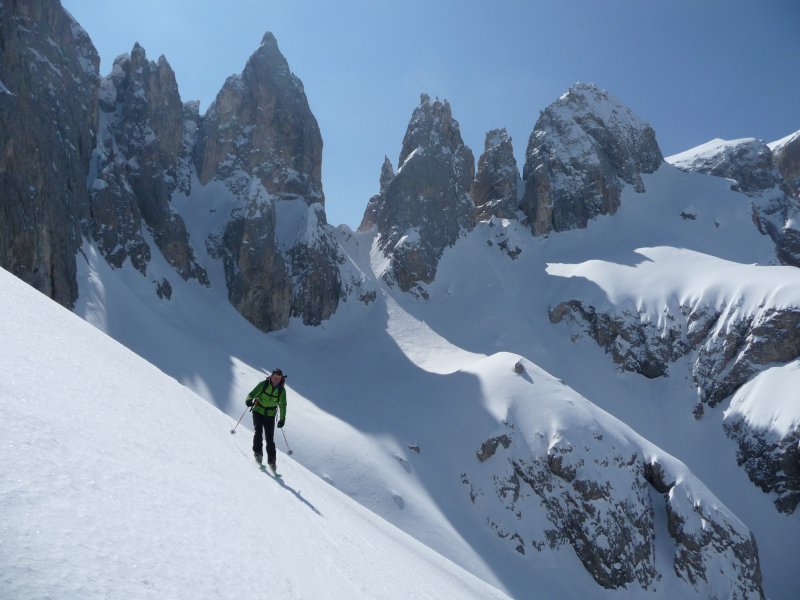 Poi, dopo breve risalita delle Farangole, si scende da Forcella Margherita (sopra il rifugio Mulaz) per una sciata di 1400 metri fino a Falcade!