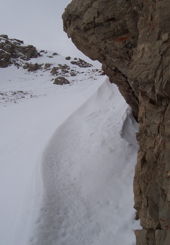 di neve che serpeggia tra le rocce di destra e il pendio, dove la neve è